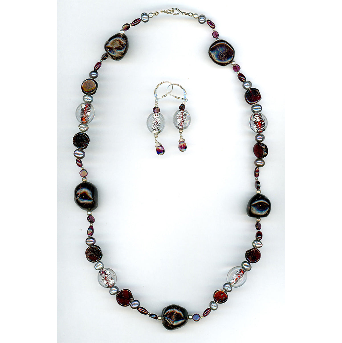 This necklace and earring set is crafted with large and luscious nuggets of almandine garnets, rhodolite garnets in olive and coin shapes hand-knotted with dark gray Chinese freshwater pearls and India glass silver foil beads. Sterling silver wire-wraps, round beads, findings, and a convenient hook-and-eye clasp. Length: 22 inches.