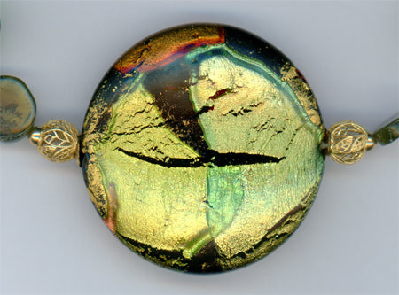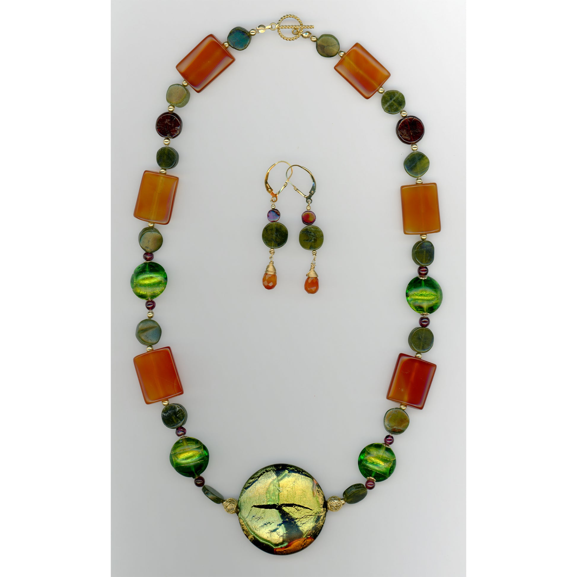 Carnelian, garnets and vesuvianite reflect the colors of the Murano art glass centerpiece. Emerald, peridot, 24kt gold-foil Murano glass beads and 14kt gold filigree round beads complete the necklace. The toggle clasp, the wire wrap in the earrings, and findings are 14⁄20 gold-filled.