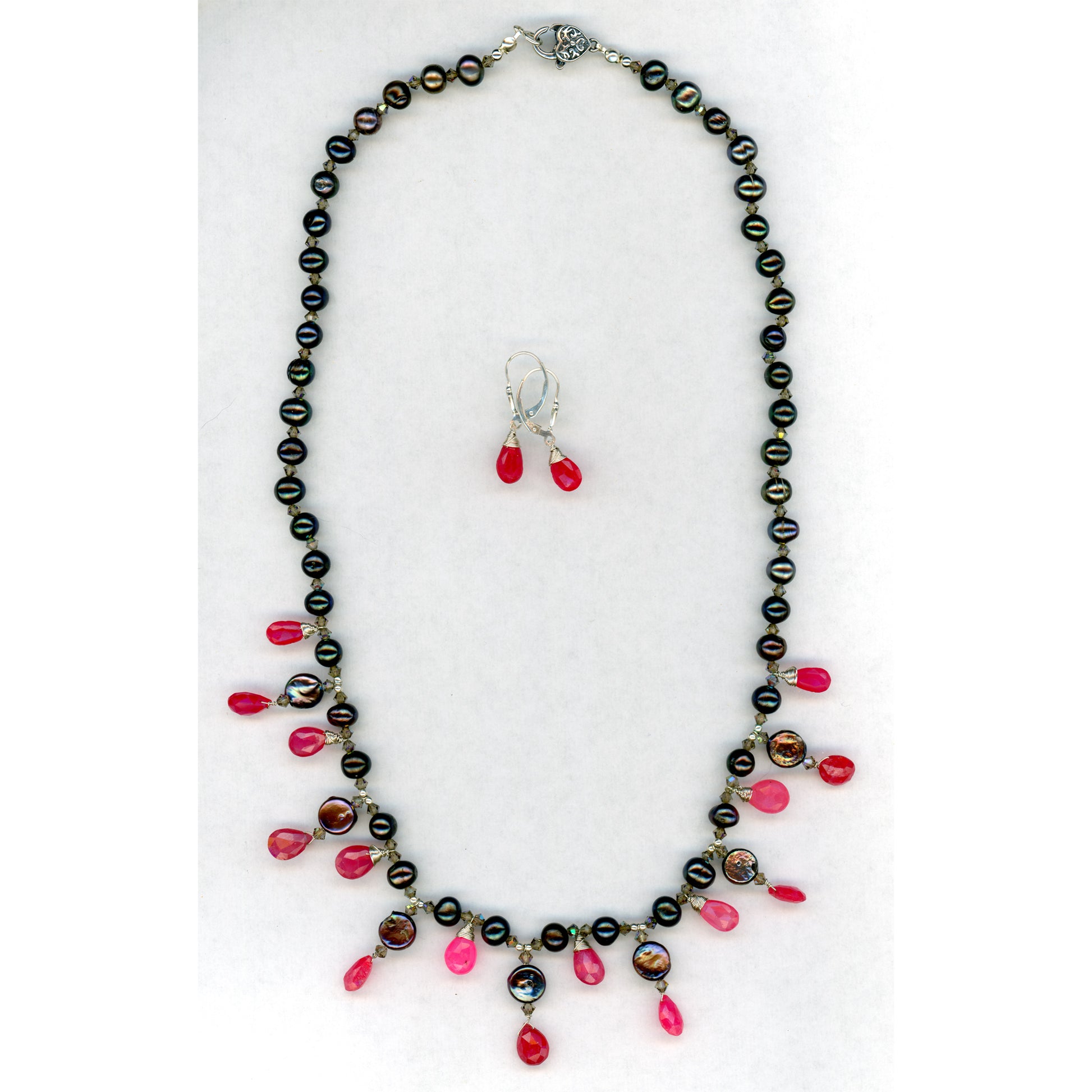 Chinese black freshwater potato pearls are hand-knotted with hot pink Indian faceted sapphire briolettes and crystal beads. The wire wraps, round beads, findings and clasp are sterling silver. Length: 20 inches, hangs at 22 inches.