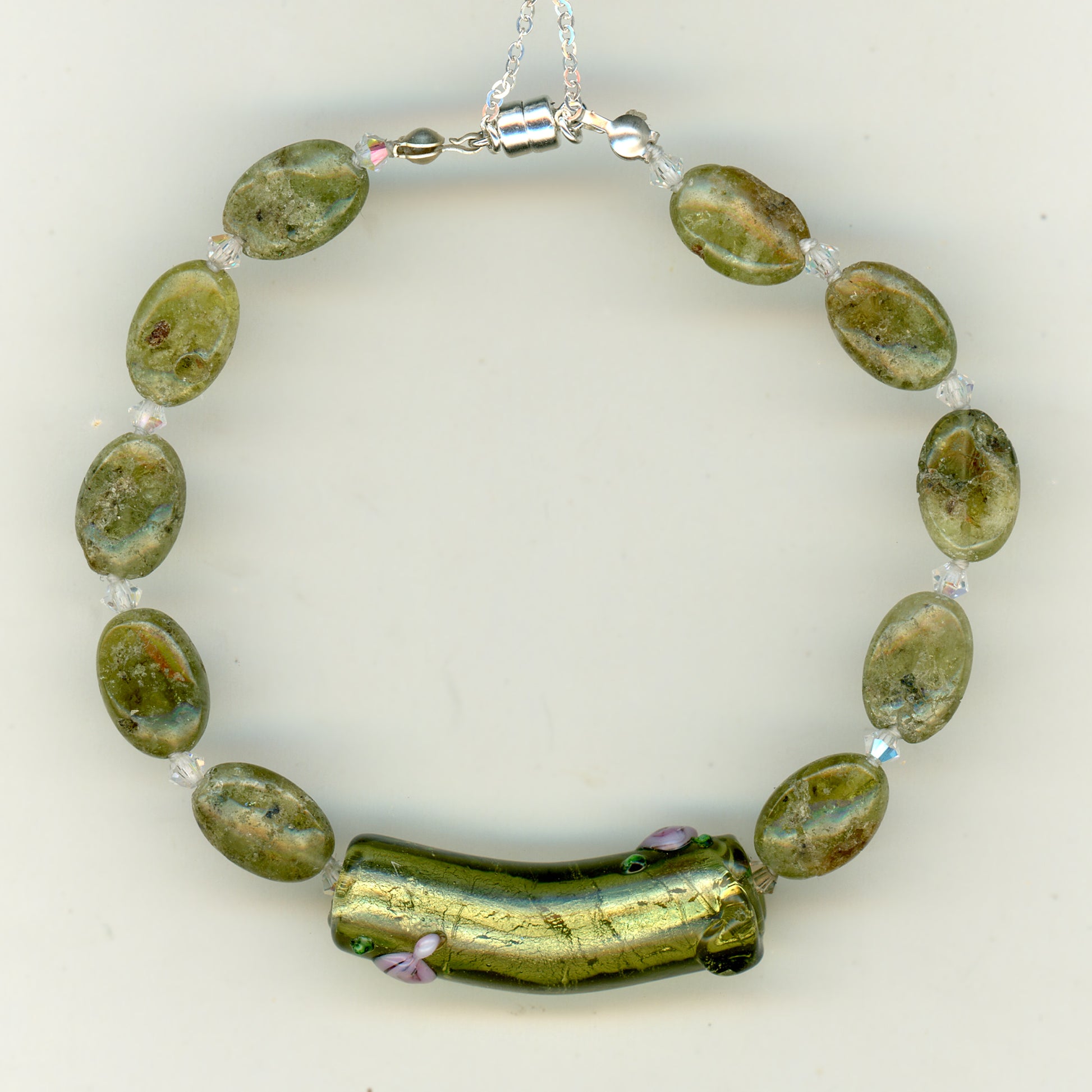 India glass silver foil elbow rose bead is hand-knotted with grossular green garnet oval beads. They are accented with Aurora Borialis crystal bicones. The findings and magnetic clasp with safety chain are sterling silver. Length: 7 inches.